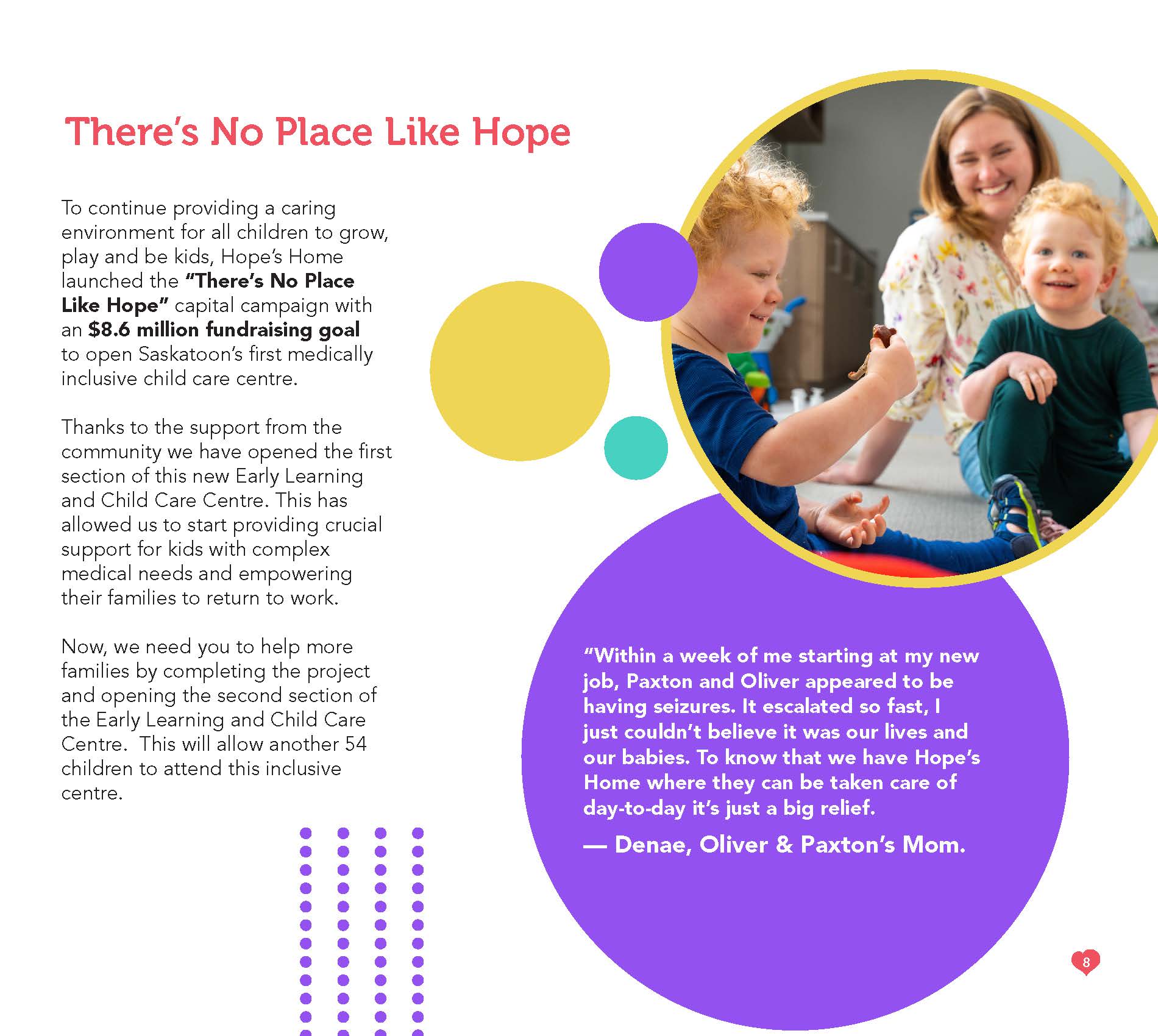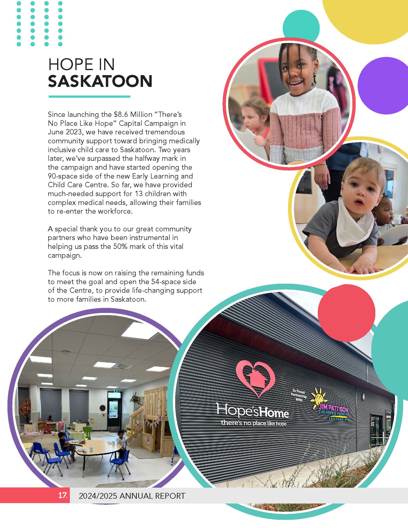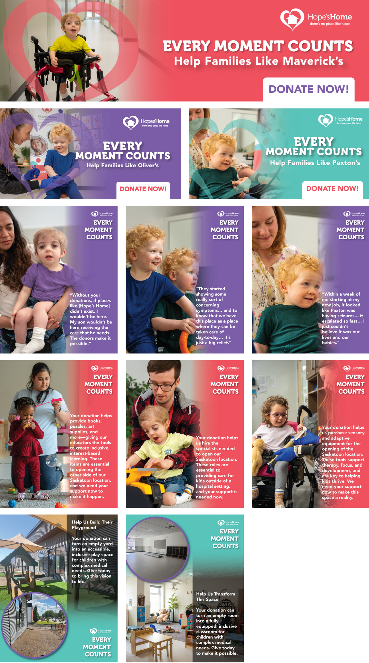 The campaign, themed “Every Moment Counts,” was designed to inspire public donations and support toward completing the second half of Saskatchewan’s first medically inclusive child care centre. From the collected interviews, photography, and video content, campaign deliverables included social media posts, billboards, bus ads, Google ads, and other collateral. Following brand standards, bright and playful visuals associated with Hope’s Home were developed to capture attention and clearly communicate the urgent need for support.